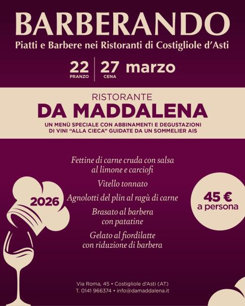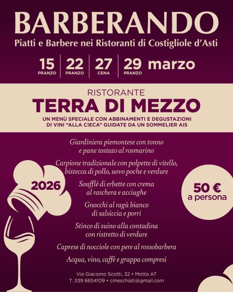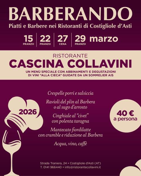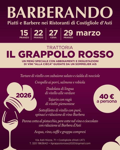 La terza edizione di Barberando si svolgerà a Costigliole d’Asti in tre domeniche di marzo e, coinvolgendo 6 ristoranti, 31 produttori di vino e 2 distillerie. Sarà l’occasione per scoprire piatti tipici locali abbinati alle migliori espressioni della Barbera d’Asti e grappe, con menù studiati per esaltare l’incontro tra cucina e vino. Coinvolgimento dei produttori e della ristorazione locale L’iniziativa mette al centro le eccellenze enogastronomiche della zona: i ristoranti aderenti proporranno piatti in abbinamento alle produzioni delle cantine di Costigliole d’Asti, creando percorsi di degustazione a menù fisso. Un sommelier guiderà gli ospiti con una degustazione alla cieca.