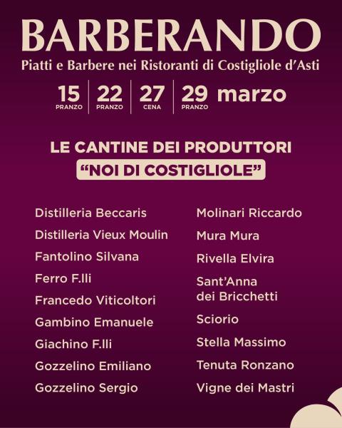 “Siamo giunti alla terza edizione di Barberando e sono molto soddisfatto di vedere come i produttori si sentano sempre più coinvolti in un progetto che mira a rafforzare la Barbera di Costigliole d'Asti nel panorama enologico, accrescendone la visibilità sul territorio attraverso la valorizzazione delle sue eccellenze.”L'evento si conferma un’occasione imperdibile per vivere l’autenticità di Costigliole, dove ogni calice racconta la fatica e la passione di una comunità che ha fatto della viticoltura un'arte. Lorenzo Gozzelino – Presidente Associazione Produttori Noi di Costigliole